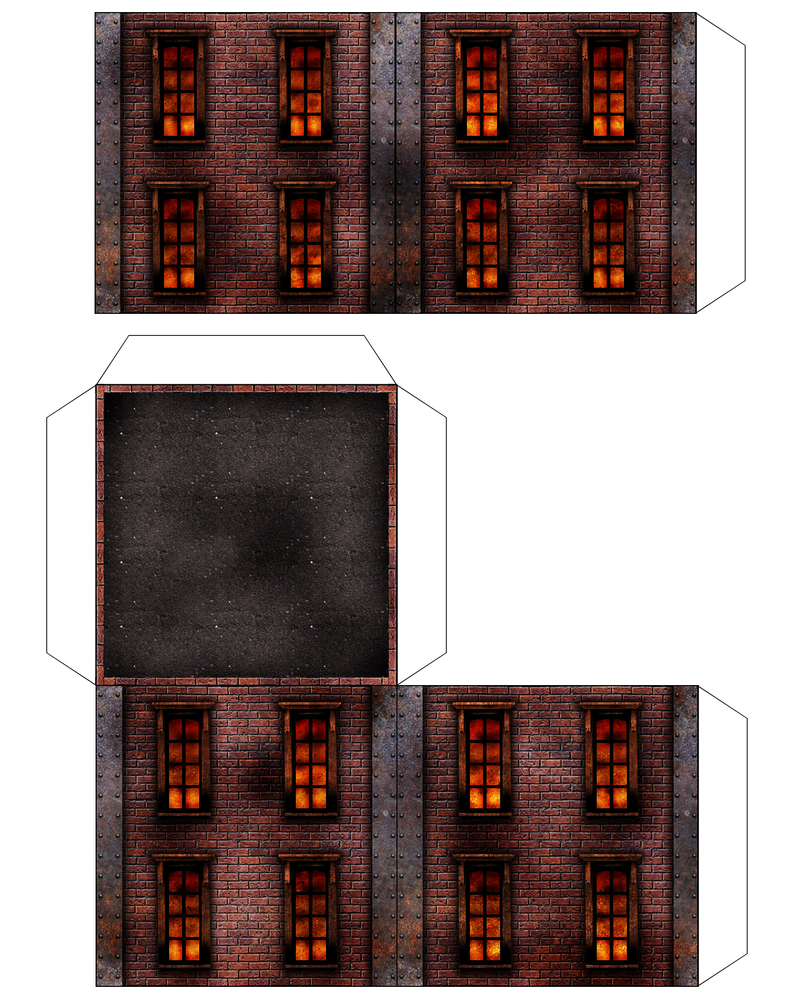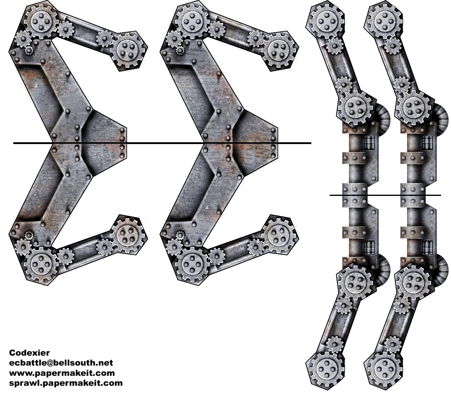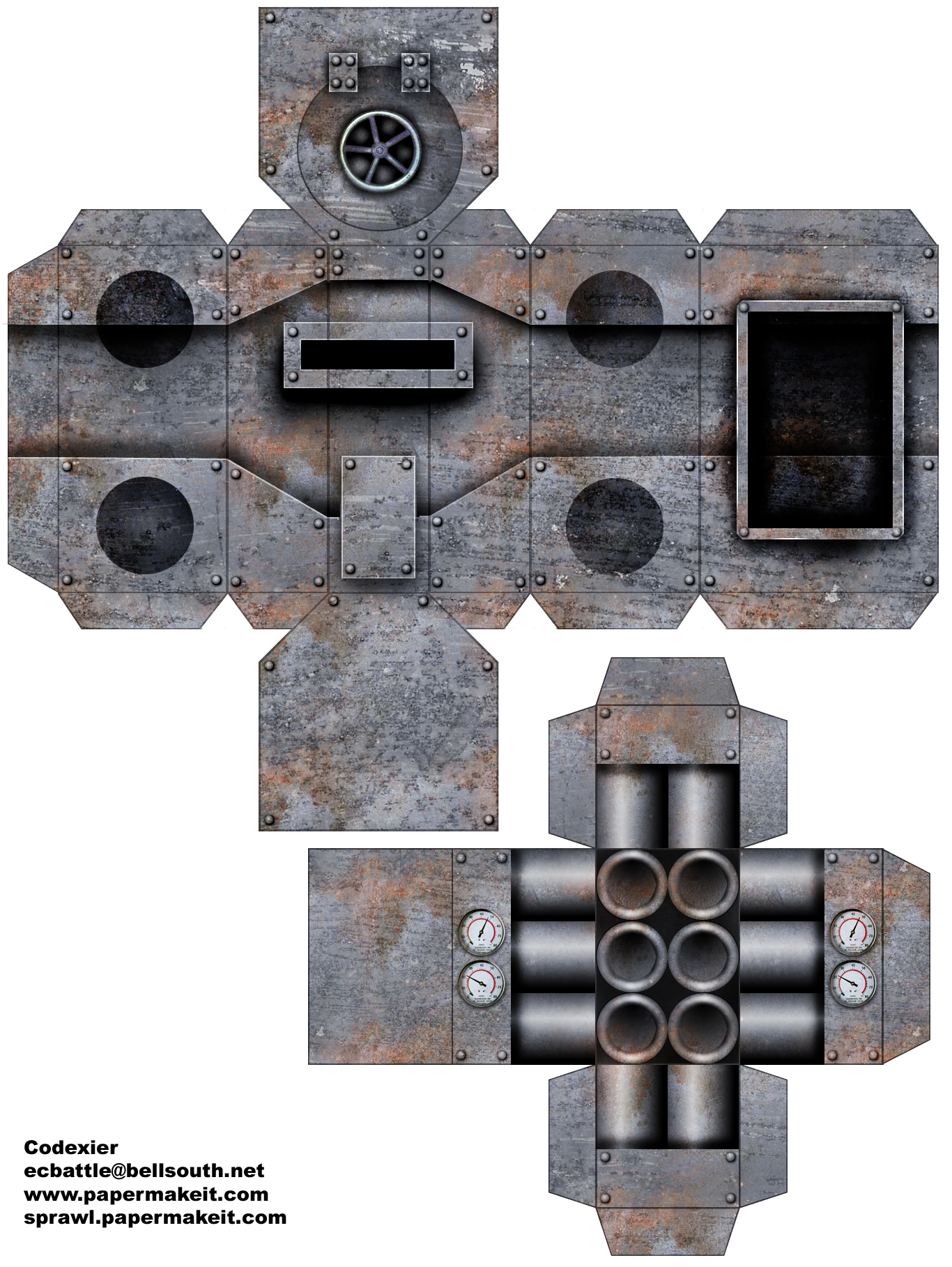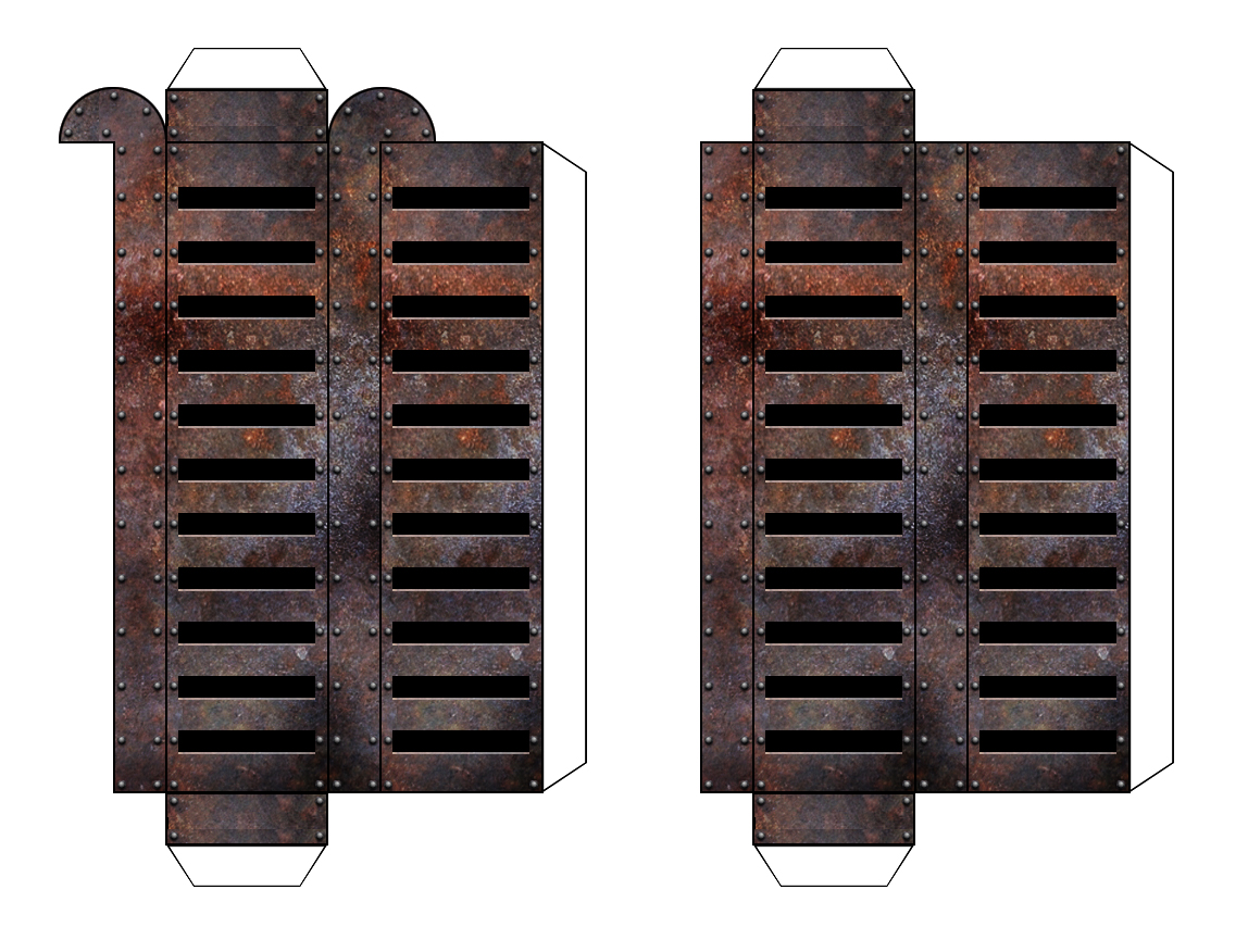A large single-man steam walker. Used by police forces and private corporate security. ![]() Main Body. ![]() Legs and Arms. Click here for Sprawl Walker PDF Instructions! These first models are simple cubes with a few add-ons to get some variation. These will be used to make the labyrinthine sector of the foundry, which scales out vertically as well as horizontally. These are older models, but should give some direction on what is in store for the Sprawl. [No instructions yet.] ![]() 3"x3" cube building block. Brick. No windows. ![]() 3"x3" cube building block. Brick. Four windows. ![]() 3"x3" cube building block. Brick. Two windows. ![]() Clocktower. Paste this on to one side of a building block. ![]() Skylight. This forms a simple triangle and would go on top of a building cube as a roof. ![]() Ladder. Glue against a wall. The version with the curved top would be glued to the top of a building, while the other goes either under that one or just up against a wall. ![]() Walkway. Shorter and longer sections with metal supports. 3 Different textured versions. The Foundry is a maze of buildings, walkways, etc. Building these around the outside of buildings and between buildings to connect them.  |